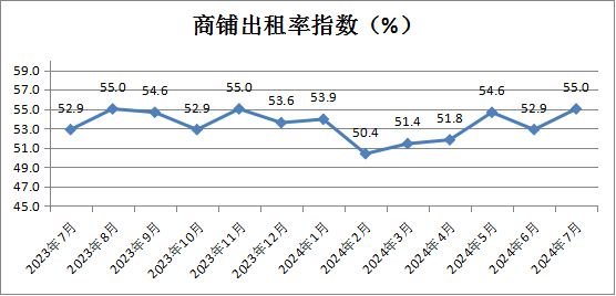 商铺出租率指数为55.0%,较上月上升2.1个百分点,维持在高位景气区间,表明租赁经营类企业对7月份的招商经营预期较好。