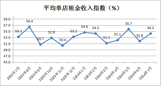 构成租赁经营类CRPI的3个正向分指数平均单店租金收入、商铺出租率和运营场所增减处于临界点上方;1个反向分指数综合运营成本变化处于临界点下方。 平均单店租金收入指数为54.3%,较上月上升2.5个百分点,表明租赁经营类企业预期7月份平均单店租金收入增速加快。