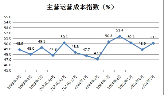 主营业务运营成本反向指数为50.1%,较上月小幅上升1.2个百分点,表明商品经营类企业主营运营成本保持稳定。