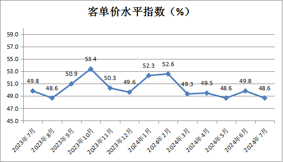 客单价水平指数为48.6%,较上月小幅下降1.2个百分点,表明随着商品集中促销季结束,商品零售客单价水平有所回落。