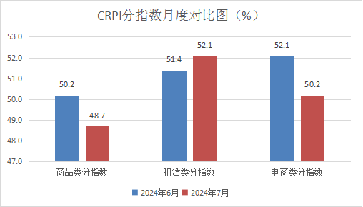 (一)CRPI三个分指数对比显示,7月份商品零售和服务零售增长趋势出现明显分化。反映商品零售状况的商品经营类指数和电商经营类指数同步下行。商品经营类指数降至临界点以下,表明线下商品零售渠道持续面临较大竞争压力。以服务零售为主的租赁经营类指数保持在中高位景气区间。