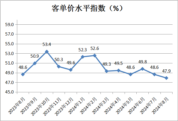 客单价水平指数为47.9%,较上月微降0.7个百分点,处于近一年以来的最低点,表明今年商品零售客单价水平较低的状况仍在持续。