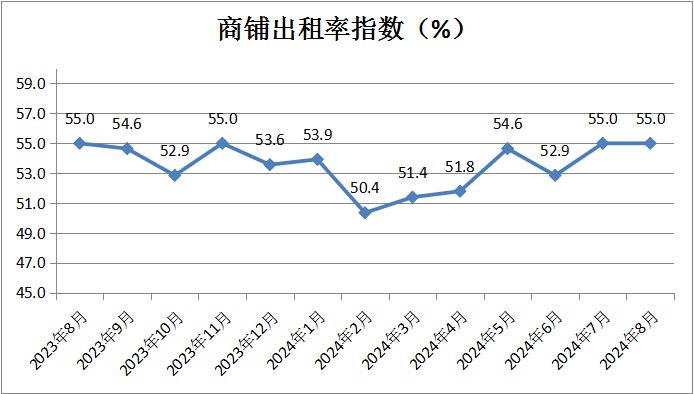 商铺出租率指数为55.0%,与上月持平,维持在高位景气区间,表明租赁经营类企业对8月份的招商经营预期依然较好。