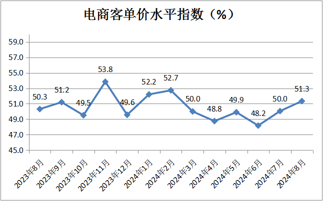 电商客单价水平指数为51.3%,较上月小幅上升1.3个百分点。分析认为,线上平台推动大宗商品以旧换新消费是8月电商客单价水平继续上升的重要原因之一。