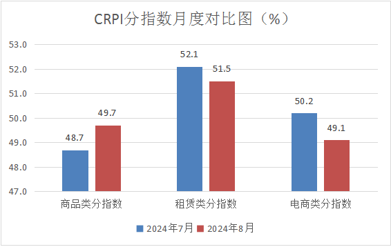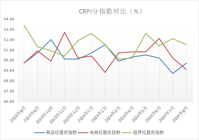 (一)CRPI三个分指数对比显示,8月份商品经营类指数和电商经营类指数均处于临界点以下;租赁经营类指数维持中高位近期区间运行。