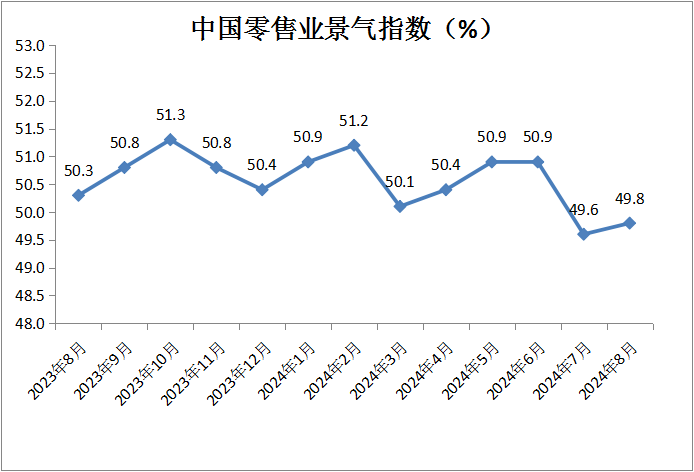 8月6日,中国商业联合会发布8月份中国零售业景气指数(CRPI)。 8月份,中国零售业景气指数(CRPI)为49.8%,较上月微升0.2个百分点。数据显示,8月份商品经营类指数回升幅度较大,较上月上升1.0个百分点,租赁经营类尽管有所下降,但依然保持近12个月持续在扩张区间运行。分析认为,商品经营类企业对走出低迷的信心更加坚定,应对措施逐渐明朗。加之以旧换新政策力度加大,商品经营类企业的政策期待较高。随着暑期即将结束和入学前消费也将促进商品零售趋势回升。