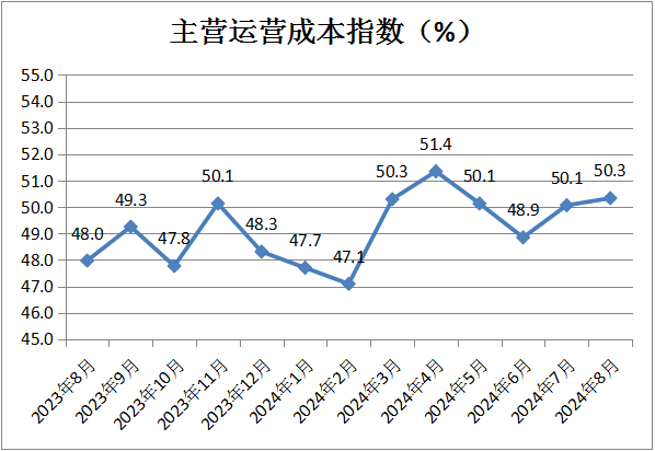 主营业务运营成本反向指数为50.3%,较上月微升0.2个百分点,表明商品经营类企业主营运营成本保持稳定。