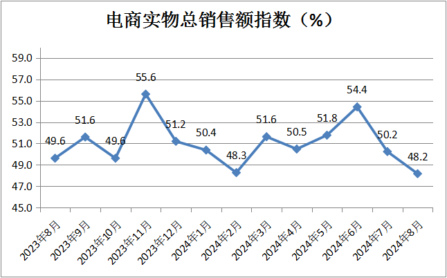 构成电商经营类CRPI的2个正向分指数电商实物总销售额、电商在线总商品数和1个反向分指数电商经营总成本均处于临界点以上,1个正向分指数电商客单价水平处于临界点以下。 电商实物总销售额指数为48.2%,较上月下降2.0个百分点,下降至收缩区间。分析认为,8月电商传统淡季是线上商品零售额指数降至收缩区间的主要原因。