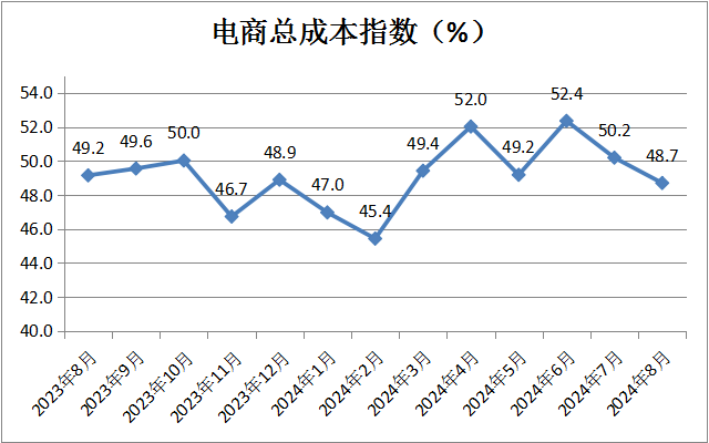 电商总成本反向指数为48.7%,较上月小幅下降1.5个百分点,连续两个月下降,表明电商经营类企业成本持续增加。
