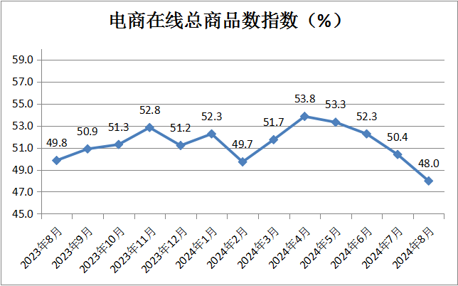 电商在线总商品数指数为48.0%,较上月下降2.4个百分点,连续4个月下降,表明电商经营类企业备货意愿较低。