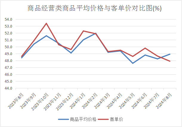 (二)数据显示,8月份商品经营类商品平均价格指数和客单价指数出现交叉背离,表明当前消费动能依然不足。