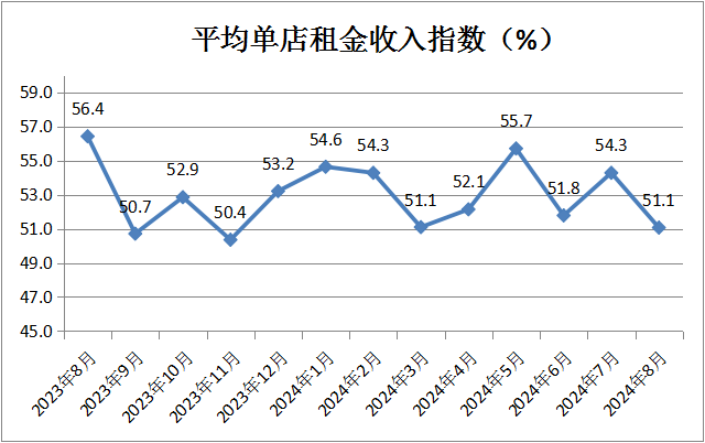 构成租赁经营类CRPI的3个正向分指数平均单店租金收入、商铺出租率和运营场所增减处于临界点上方;1个反向分指数综合运营成本变化处于临界点下方。 平均单店租金收入指数为51.1%,较上月下降3.2个百分点,表明租赁经营类企业预期8月份平均单店租金收入增速回落,我们注意到较比2023年同期,下降了5.3%,说明房地产行业的影响在持续。